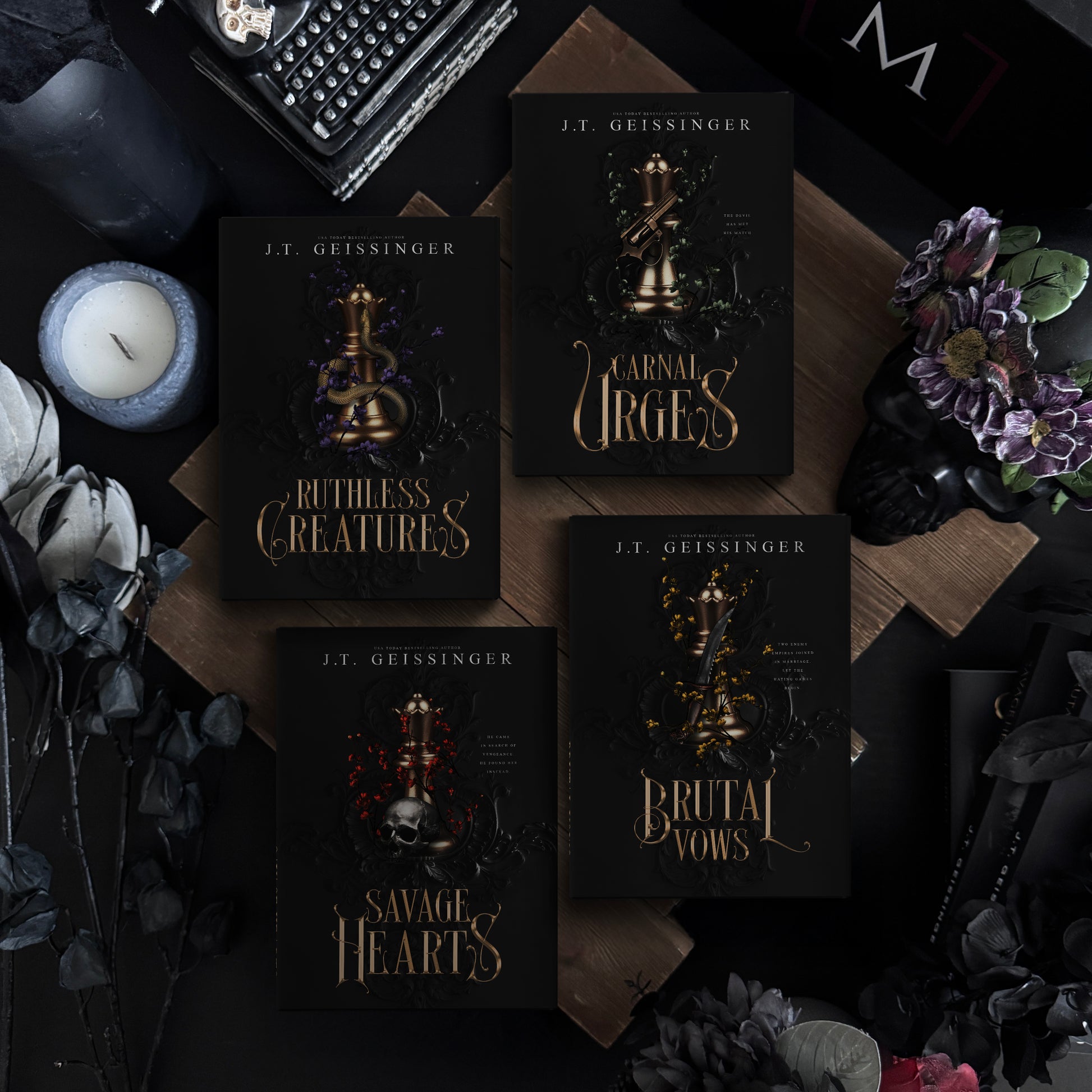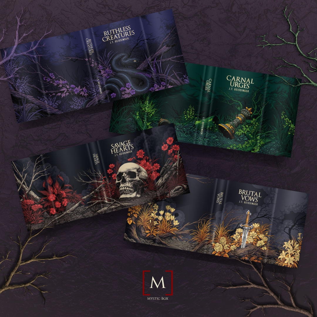 Special Edition box featuring Queens & Monsters by J.T. Geissinger. This box will include Ruthless Creatures, Carnal Urges, Savage Hearts & Brutal Vows.